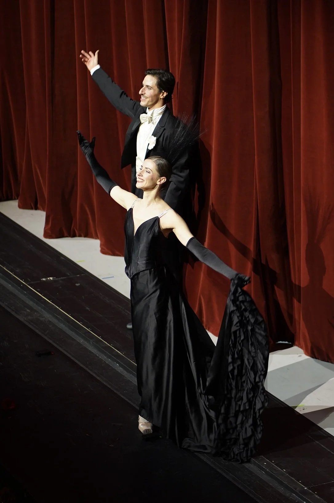 The Csárdás Soloist, Duccio Tariello, gave life to what I consider a quite „boring” part of the choreography. But he showed stage presence, a good technique and poise, which is „Conditio Sine qua Non” to this role. He was supported by two lovely dancers, who played the „First” girls of the Csárdás Number, which, in fact, has nothing to do with the rest of the storyline and is considered more of a Divertissement, with no real purpose for the storytelling: Milda Luckuté and Laura Cislaghi, who are totally different but complement each other visually and emotionally.